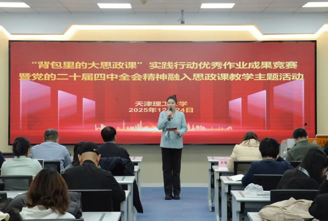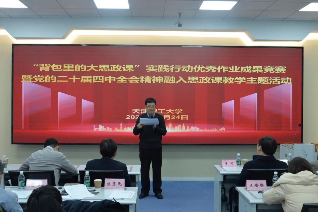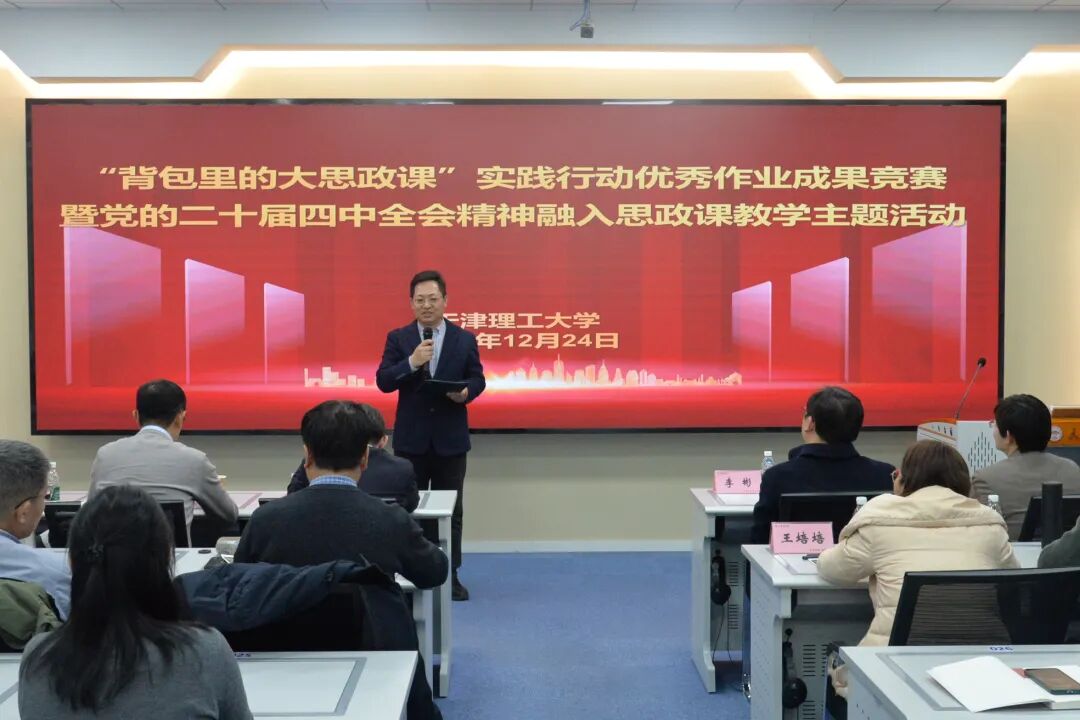为深入学习贯彻习近平新时代中国特色社会主义思想,贯彻落实习近平总书记关于思政课建设的重要指示精神和全国教育大会精神,不断拓展实践育人和网络育人的空间和阵地,激发青年学子走出课堂教室、关注社会发展的热情,12月24日下午,天津理工大学党委宣传部、党委学生工作部、教务处、校团委、马克思主义学院主办的“背包里的大思政课”实践行动优秀作业成果竞赛暨党的二十届四中全会精神融入思政课教学主题活动在马克思主义学院智能思政·红色全景爱国主义教育教室顺利举办。天津理工大学党委常委、副校长叶宁、学生工作部部长袁卫国、教务处处长李彬、校团委书记刘利奎、党委宣传部副部长王天耀及马克思主义学院班子成员莅临现场,各教研室主任担任评委,各队伍指导教师、参赛学生共同参加。