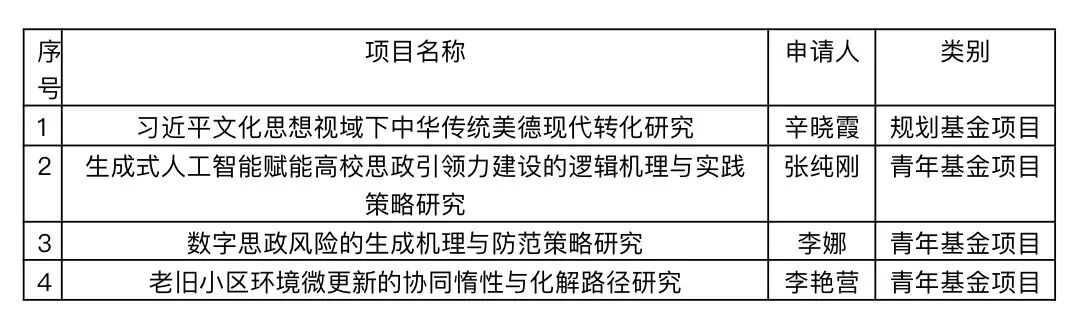 近日,教育部社科司公布了2025年度教育部项目评审结果,马克思主义学院五位教师辛晓霞、张纯刚、李娜、李艳营、徐小敬分别在人文社会科学研究规划基金项目、人文社会科学研究规划青年基金项目、高校思想政治理论课教学研究青年项目上获批立项。